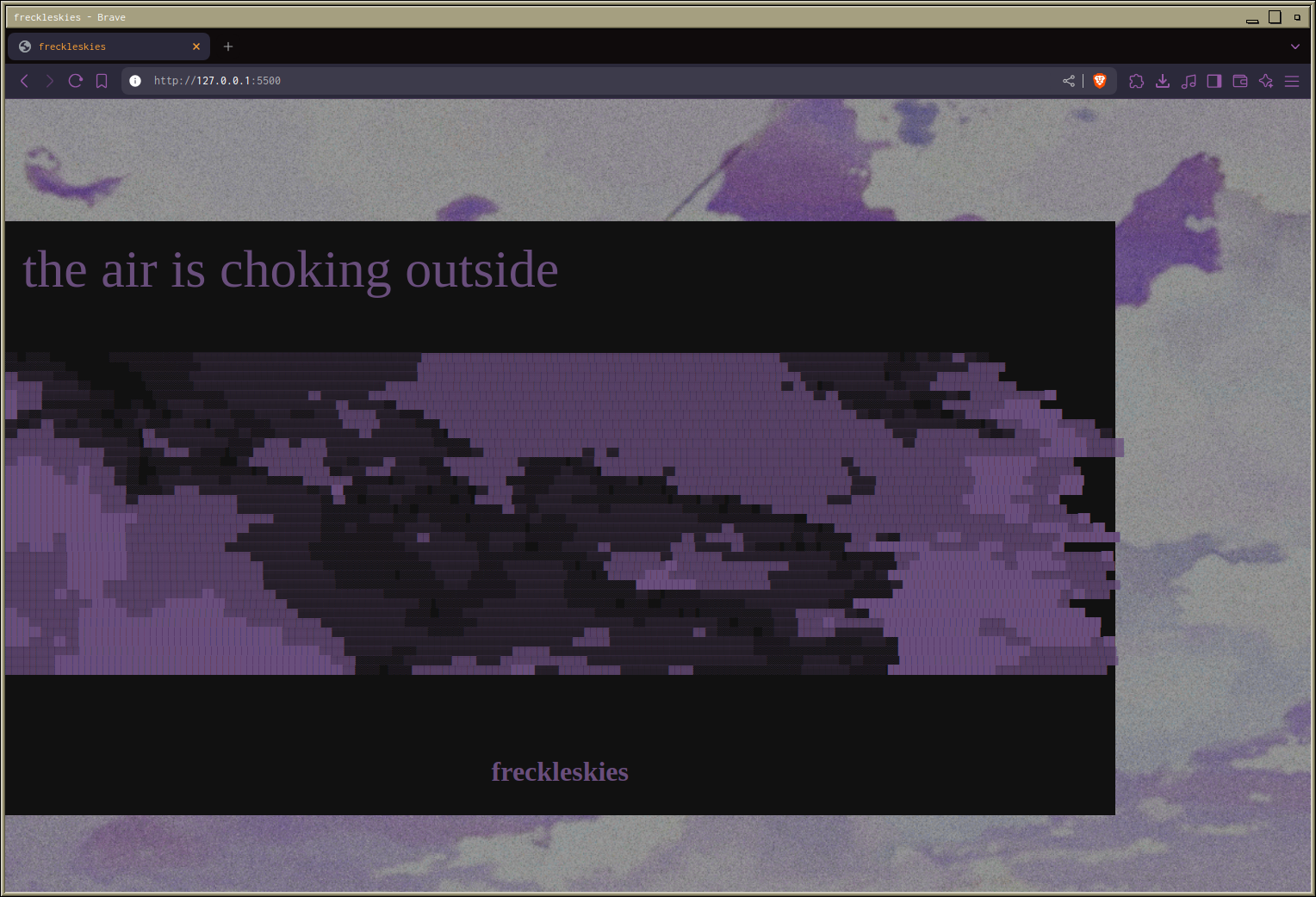 this already screams "under construction". the window wasn't centered, yet the cloud was animated? the original epithet (? it's more of an aperçu? anyway), "the air is choking outside", takes me back. i don't remember how i came up with it, nor do i remember how i came up with the current one other than wanting something a bit more, i guess on theme or direct. though looking at it now i kind of prefer it. hmm...