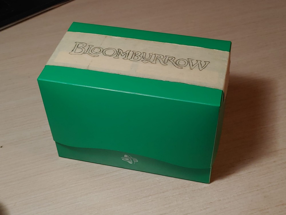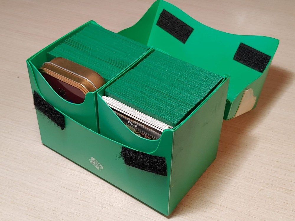 it opens! i'm very proud of this box. i used a gamegenic double deck holder 200+ XL box to which i fitted some velcro so the lid stays open. without the velcro the box easily hopens itself in a bag under the weight of the cards inside, but just those two little straps of velcro are enough to pass the throw-it-up-in-the-air-spinning-as-fast-as-you-can test without opening. i was very happy to find out that it holds more than 200 sleeved cards, meaning i got plenty of space for accessories